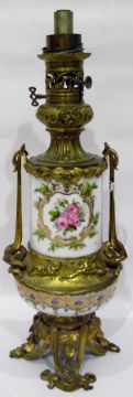 Continental ormolu-mounted porcelain lamp with fittings, by Bright Late Arcand & Co, Bruton Street, having cylindrical white porcelain body, painted with classical female figure with arch, flanked by cherubs and rose sprays, ornate foliate ormolu borders, strapwork handles, with relief putti ormolu border, the waisted base with scroll and foliate supports, 50cm approx