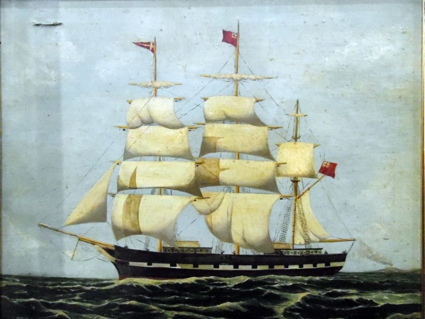 19th century English schoolGouache Ship's portrait off coast, unsigned (tear to top left of canvas), 58cm x 74cm
