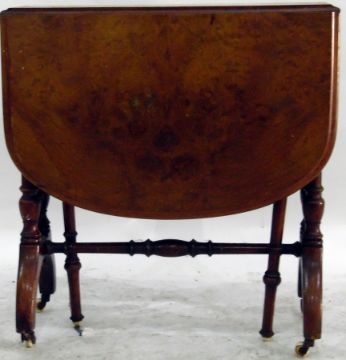 Late Victorian walnut veneered sutherland table, the top with moulded rounded borders, on turned supports and central stretcher and ceramic castors, width 59cm