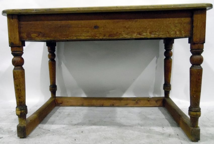 Victorian rectangular scrubbed top pine kitchen table with rounded corners, frieze drawer, on turned tapering legs, raised on a platform base, width 120cm