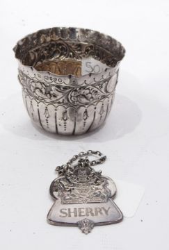 Victorian silver bowl with repousse decoration, London 1886, makers John Aldwinckle & Thomas Slater, 8cm diameter, 2.3oz and a silver sherry label, 1.2oz (2)