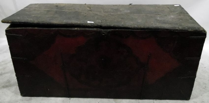 18th century Nepalese pine plank chest with ironwork corner brackets and supports, the front with traces of decorated design, length 120cm