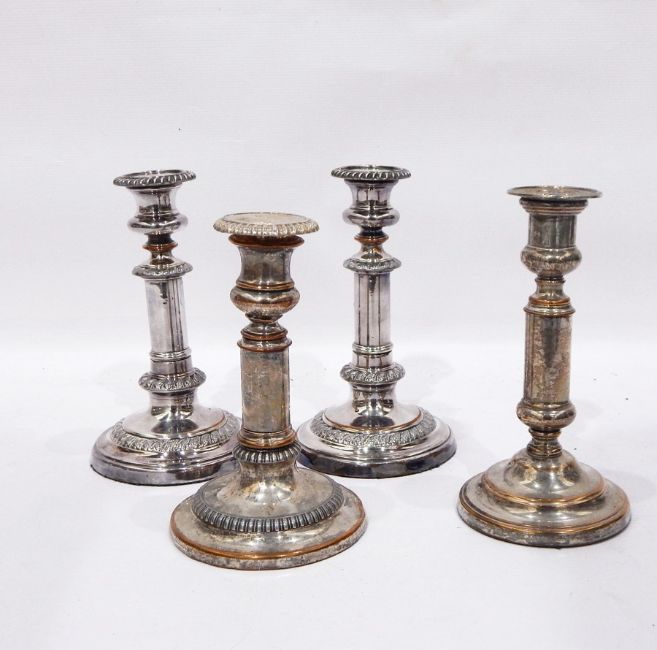 Pair of silver plated on copper telescopic candlesticks with gadrooned borders, on circular base and two other similar plated on copper telescopic candlesticks (4)