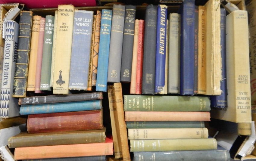 Militaria - various wars, Bert Hall 'One Man's War', Percy F. Westerman 'Tireless Wings', John Darcy Dawson 'Tunisian War' etc ( 3 boxes)