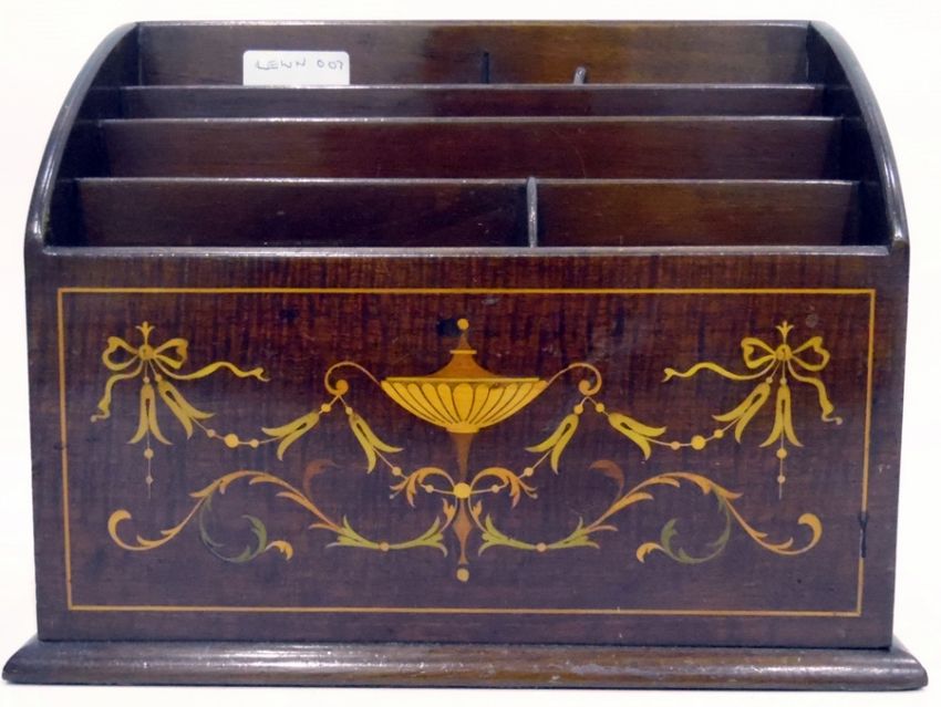Inlaid mahogany stationery rack with stepped arched top, inlaid with vase, husk and ribbon decoration, 25cm wide