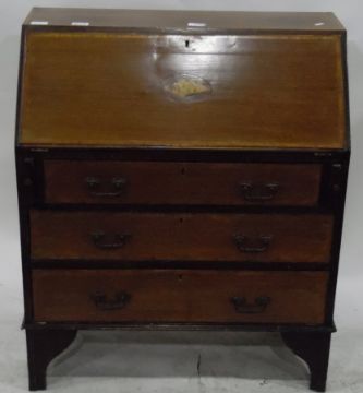 Edwardian mahogany bureau, the fall front with inlaid shell decoration over three long drawers, on bracket feet, 75cm wide