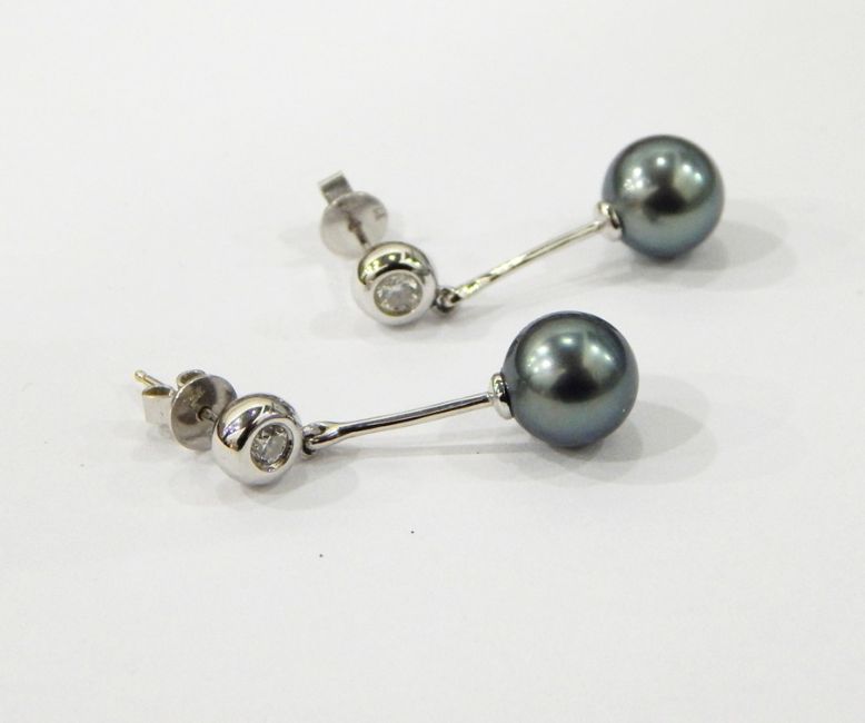 Pair of 18ct white gold, diamond and Tahitian pearl drop earrings, the pearls 8cm in diameter, 2g total