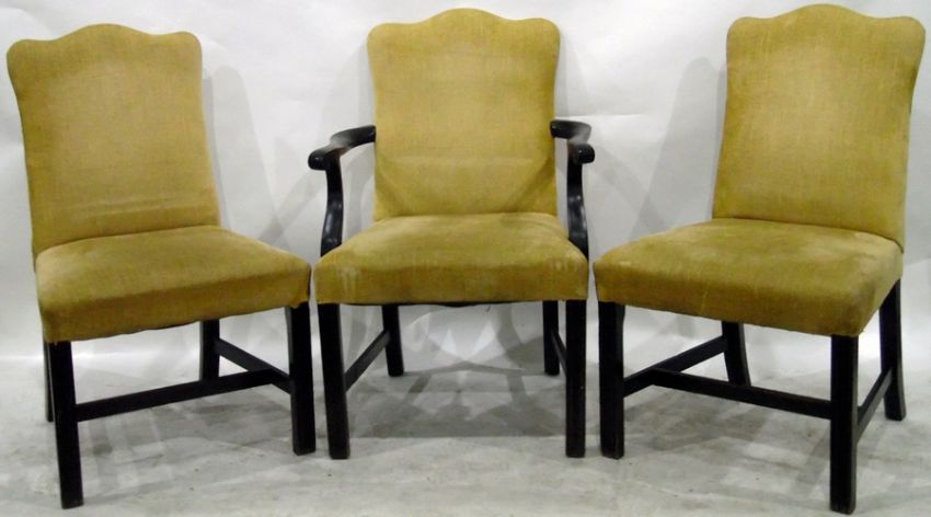 Set of six boardroom elbow chairs with outswept arms, on reeded square supports, with upholstered backs and seats