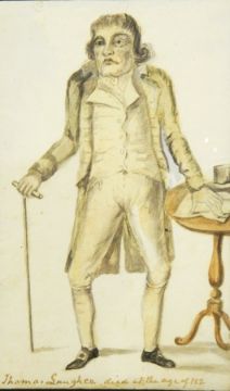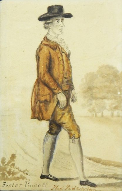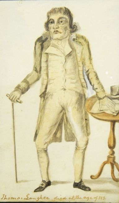 Watercolour Drawings,UnattributedLate 18th century caricatures, named, ie 'Foster Powell The Pedestrian', 'Bertholde Prime Minister of Albinus, King of Lombardy', Thomas Parr who died at the age of 152 years', 'Little Will at the Turk's Head coffee house', 'Thomas Laugher died and the age of 112' and 'Lord Lovat' ( there is a signature 'Simon' bottom left of this drawing) (6)