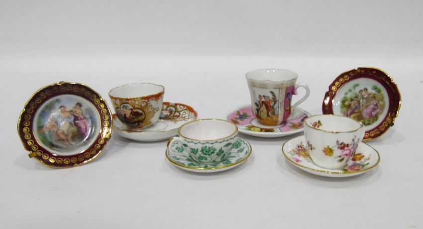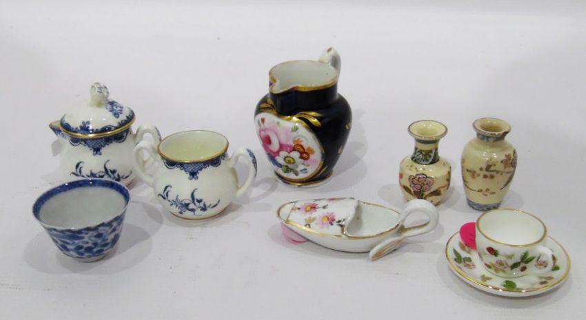 Quantity of miniature ceramic items to include a Spode cup and saucer, Derby posies cup and saucer, Wedgwood cup and saucer, Chinese miniature blue and white tea bowl, miniature reproduction Worcester and other items