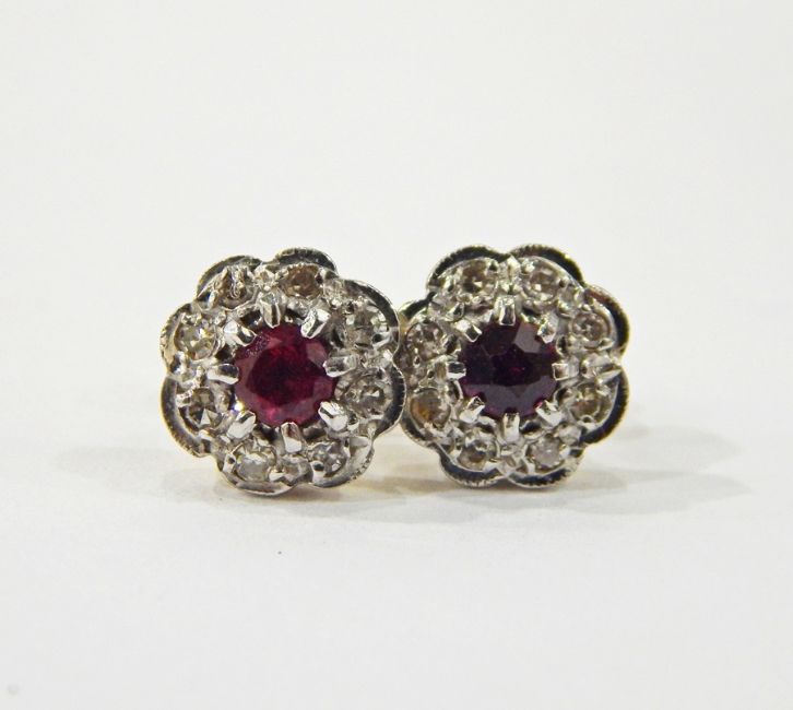 Pair of 18ct gold, ruby and diamond flower-shaped earrings, the centre ruby 4mm diameter, surrounded by eight small diamonds, 4g total