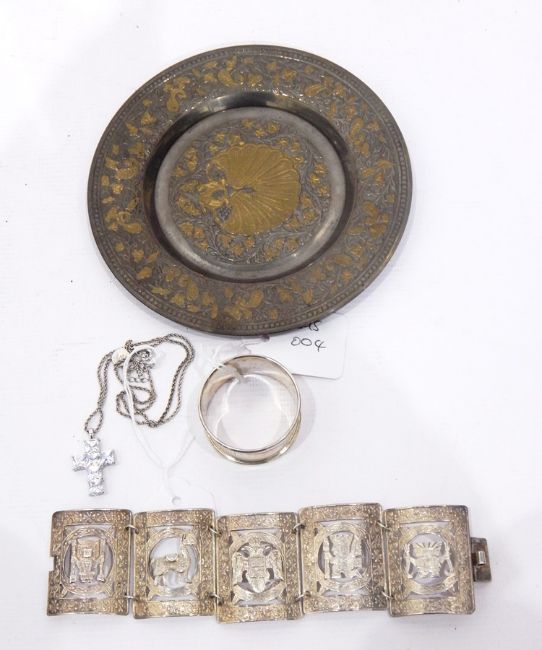 Silver napkin ring in box, a Swarovski diamante crucifix pendant on chain, a silver engraved bracelet, marked Peru 925 and a metal circular dish decorated with a peacock