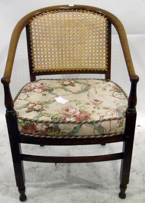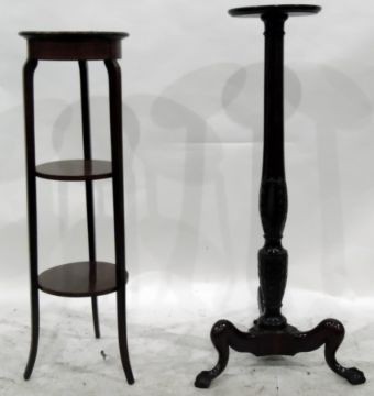 Edwardian circular top plant stand with two further shelves, on square tapering legs, diameter 32cm, a Georgian style mahogany plant stand, the circular top on reeded column support and splayed legs, a mahogany two-tier tea trolley with shaped gallery surround, on square fluted legs with castors, width 61cm and a cane chair (4)