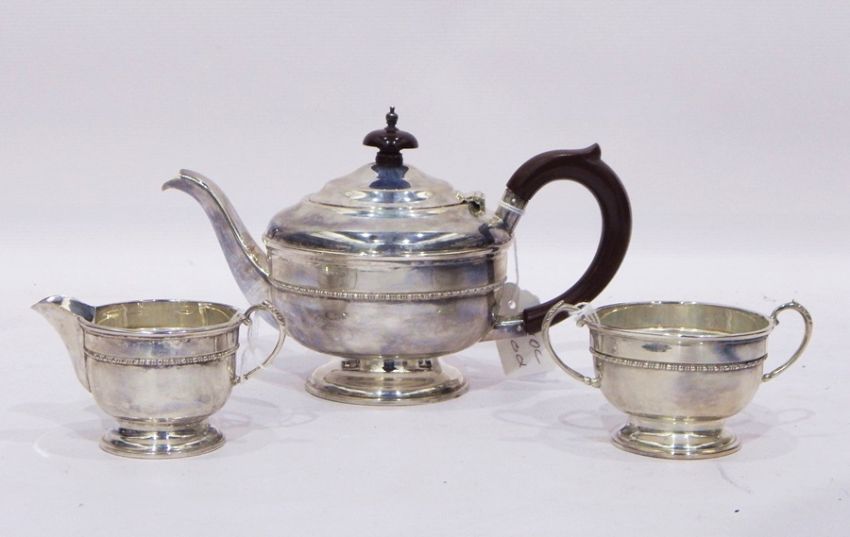 Early 20th century silver three-piece teaset to include circular pedestal teapot with gadrooned rim, matching sugar bowl and milk jug, Birmingham 1933, 10oz gross approx (3)