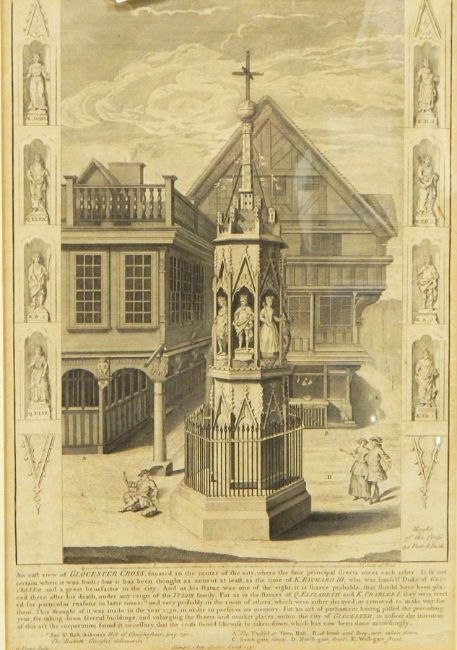Engraving of the "East View of Gloucester Cross" dated London 1751, 43.5cm x 29cm