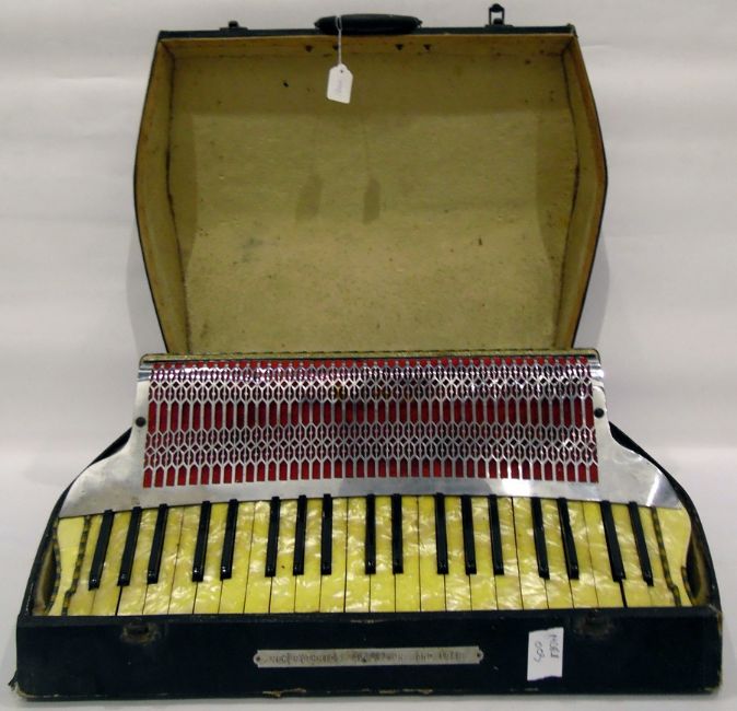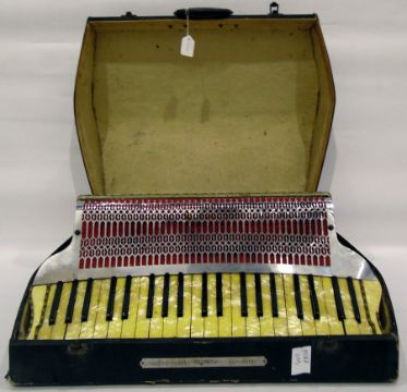 Antoria-S.I.L.A. Omega accordion in bakelite and chrome, decorated, within its original leather carry case