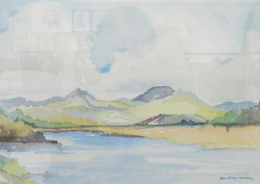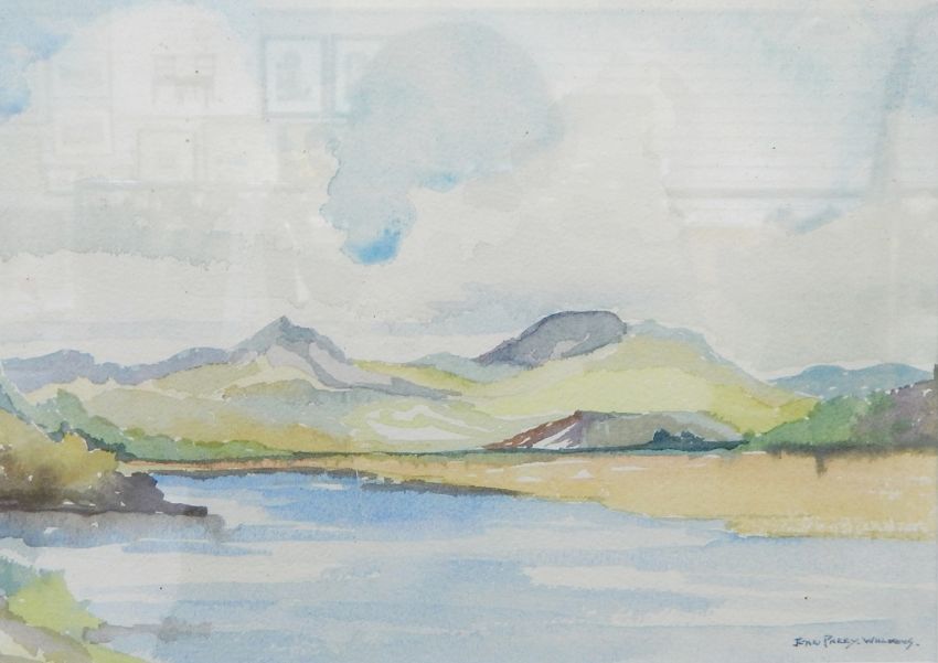 Jean Parry Williams (1918-2010) Watercolour Lake scene with river, signed lower right, 19cm x 27cm Pen and ink drawing"Waterfront Boston"Roy Ralph (20th century) Pen and wash Abstract landscape with figures, signed lower left and dated August 88, 19cm x 28cm and a floral watercolour (4)