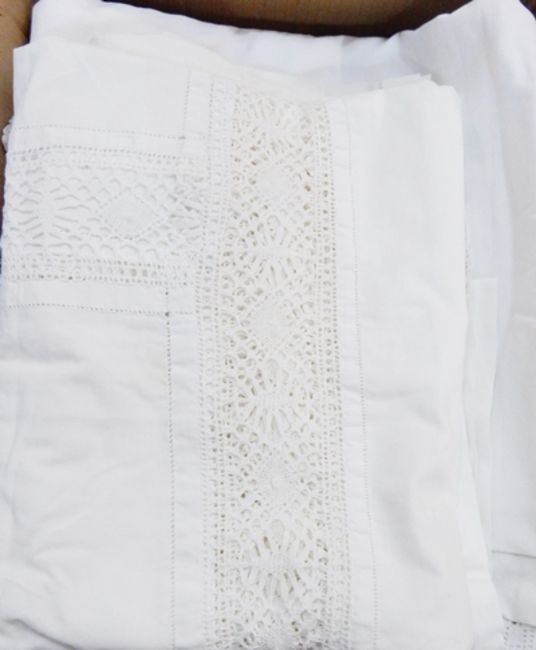 Large cut and drawn thread tablecloth and others, crocheted table linen, damask napkins, hand towels, etc (2 boxes)