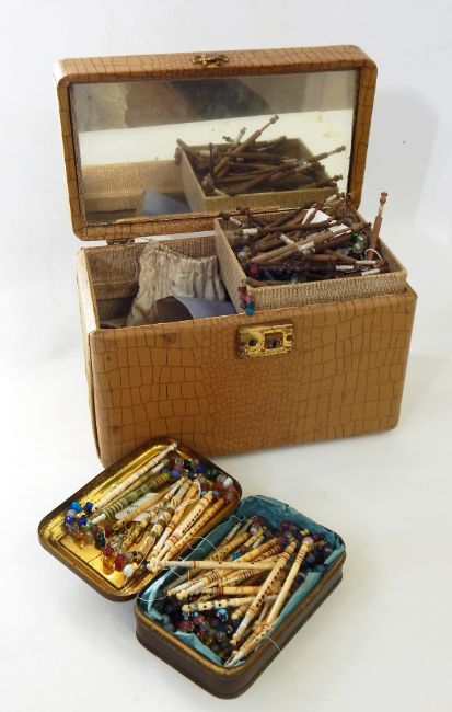 Approximately 41 turned bone lace bobbins, some dot engraved, foil spirals, all wire-bound, beaded, many with girls names, ie Edith, Lucy, Anne, Elizabeth, Mary and boys names Adam, James, also 'Dear Sister', 'Love Don't Be Falcs (sic)', 'Love Forget Me Not', a large collection of wooden lace bobbins and various lace patterns on velum, all within a faux-crocodile vanity case with mirror