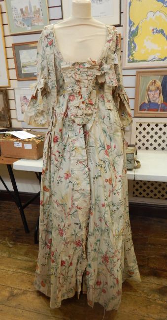 A hand stitched floral glazed cotton dress, 18th century style, unfinished with underskirt and bronze cotton petticoat, a separate unfinished stomacher, boned laced bodice, the fabric possibly mid/ late 19th century
