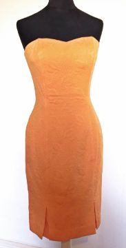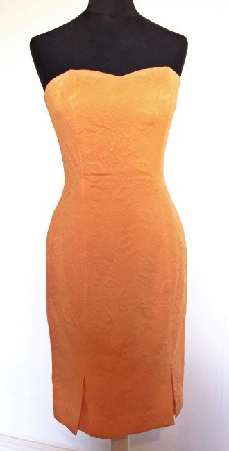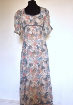 Oscar de la Renta 'Miss O' 1970's silk dress, full sleeved, deep collar with bow, Richard Shops printed cotton maxi dress, a multi patterned silk maxi dress and 1992 Bruce Oldfield orange jacquard cocktail dress (4)