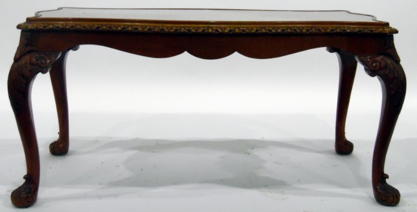 Walnut veneered shaped rectangular coffee table with inset plate glass cover, the cabriole supports with carved shell knees and claw and ball feet, 99cm long