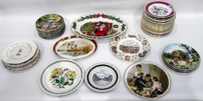 Large collection of various collectors plates including 'RHS Chelsea Flower Show' plates, Pendelphin plates, Coalport 'Tale of the Country Village' plates (some with certificates), and a porcelain serving plate