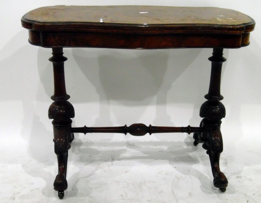 Victorian burr walnut veneered and inlaid stretcher table on turned standards and turned pole stretcher, carved and shaped supports and with brass castors