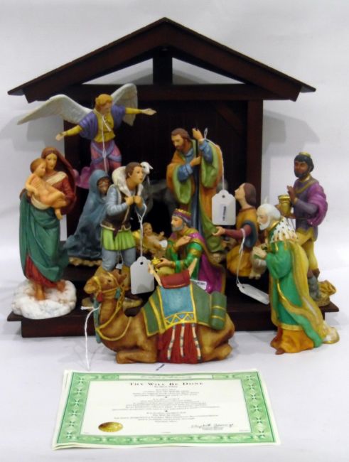 Franklin Mint and tinted bisque nativity group, titled 'We'll Be Done' by Alton Tobey together with wooden stable and certificate