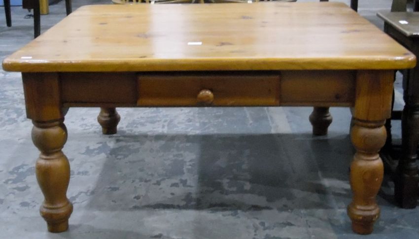 South African pine square magazine/coffee table fitted a drawer to frieze, on stout turned supports, 99cm square