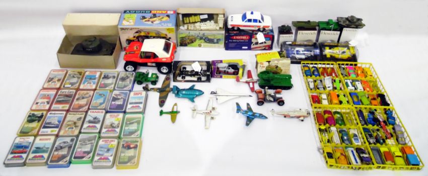 Quantity of Top Trumps playing card sets, a battery operated sand buggy, a talking police car and various Matchbox and Corgi cars, etc