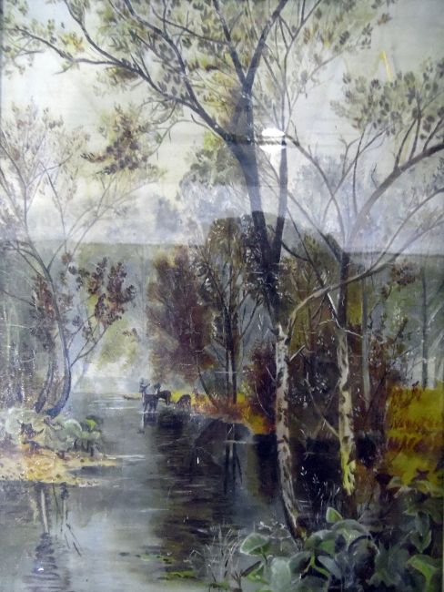 UnattributedPair oils on canvas under glassLake scenes with deer and swans 39cm x 29cm, framedLimited edition printNorman Battershill, no 88/1000, signed in pencil in margin, A Sussex Lane, framed postcards, two reproduction maps, a picture frame, etc
