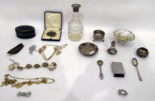Silver mounted glass decanter (missing stopper), a silver coffee spoon, a quantity of silver plated items, costume jewellery and jewellery boxes