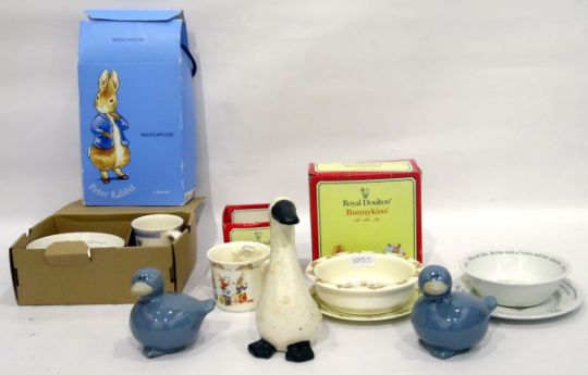 Wedgwood Peter Rabbit bowl and mug set (boxed), a Royal Doulton 'Bunnykins' bowl and mug set (boxed), further Bunnykins and Beatrix Potter items and a glazed stoneware model of ducks