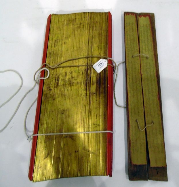 Buddhist Pali manuscript, the text incised on rectangular gilt edged palm leaves and contained between two red lacquered sandalwood boards, 49cm long and a smaller manuscript contained between pair plain wood boards (2)
