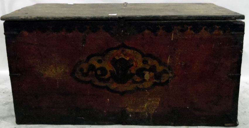 18th century Nepalese pine chest with iron strap hinges and clasp, the front with painted floral decoration, width 114cm