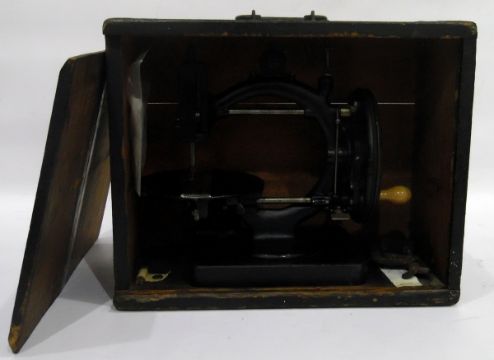 Late 19th century C-framed sewing machine, undecorated, with turned wood handle, in the original wooden case
