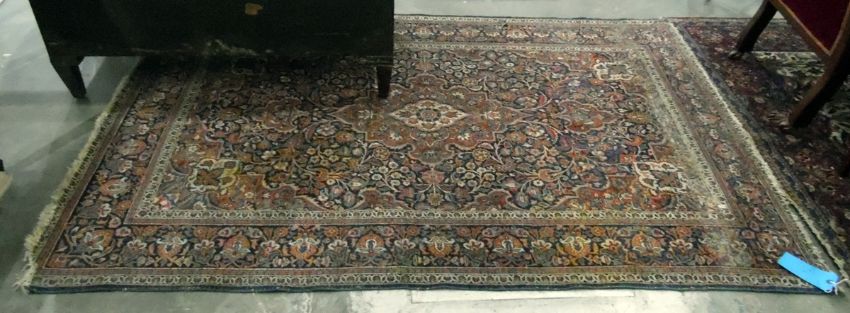 Antique Eastern wool carpet of Persian design, the midnight blue field centred by floral arabesque and having surround of scrolling flowering sprays, ivory palmettes to the spandrels, trailing anthemions and stylised flowers to the border and having formal floral smaller borders and geometric guard stripes, 196cm x 131cm (some wear)
