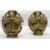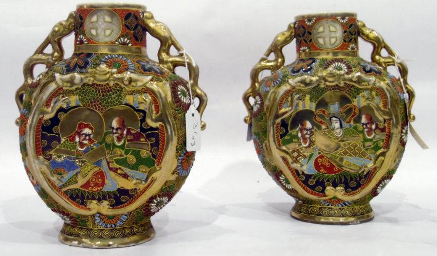 Pair of Japanese Satsuma earthenware disc vases, each with pair of gilt dragon handles and decorated with Shimazu Mon figures to panels, 26cm high