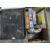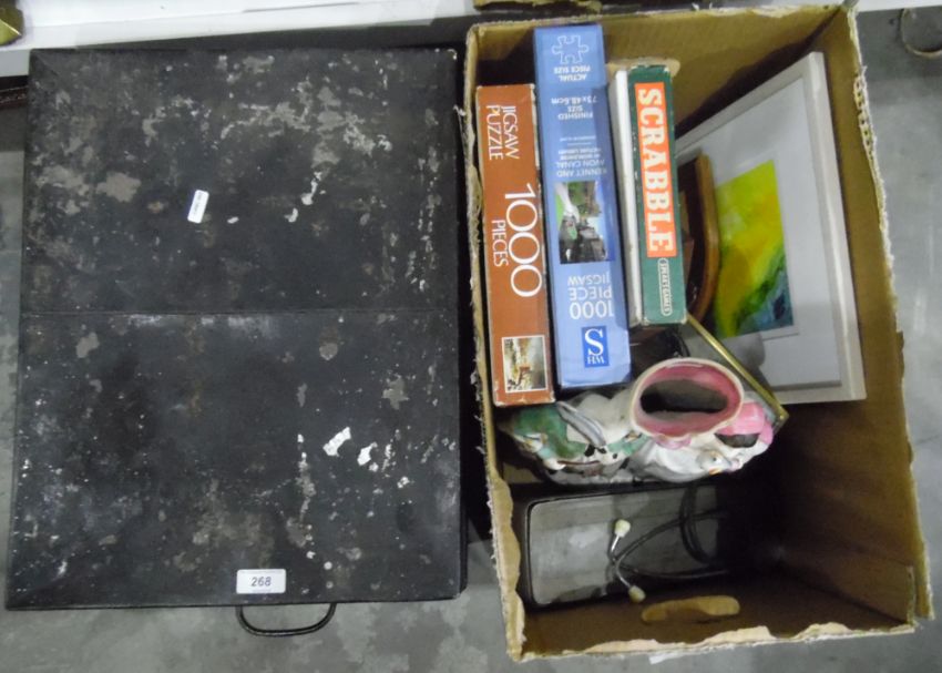Assorted jigsaws, a Staffordshire flatback figure, prints and a tin trunk (2 boxes)
