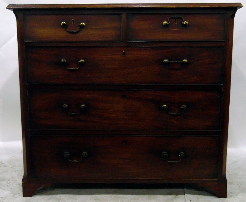 Georgian mahogany straight front chest of two short and three long graduated drawers, with brass swan neck handles, chamfered canted corners and bracket feet, width 107cm