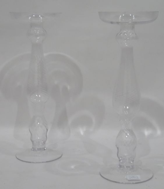 Pair of modern glass baluster-shaped pillar candlesticks of spirally wrythen form, the saucer-shaped tops to hold wide bottom pillar candle, 44cm high (2)