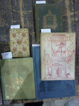 Monier Williams "Sakoontala or The Lost Ring, an Indian drama translated by Monier Williams", half title and title page, plates by George Measom after T Sulman, all decorations heightened in gold, plates, original viridian cloth, elaborate gilt blocked decorations and titles, designed by Knights & Keeling, after Sulman, Hertford, printed and published by Stephen Austin (Stephen Austin was printer to the East India College, established by the East India Company in 1805), the backboard and backstrip are detaching"The poetical works of Robert Browning" 1984 but in an embroidered coverBarrie, J M "Peter and Wendy", illustrated by F D Bedford, decorated front cover and backstrip, front board faded"The Tempest", a comedy by William Shakespeare, decorated by Robert Anning Bell, Freemantle & Co 1901, profusely decorated with woodblock illustrations, decorated end papers, decorated boards but shelf worn and spine faded W Heath-Robinson (ills)"Shakespeare Comedy of a Midsummer Nights Dream", Constable & Co 1914, colour frontis tipped in, decorated title page, colour plates tipped in throughout and black and white illustrations, small folio, decorated blue cloth (5)