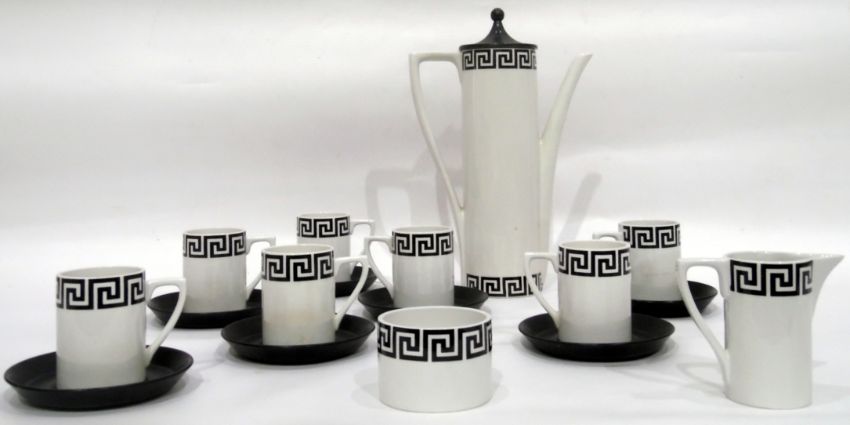 Susan Williams-Ellis for Portmeirion pottery 'Greek Key' coffee service comprising coffee pot, similar cups and saucers, milk jug and sugar bowl