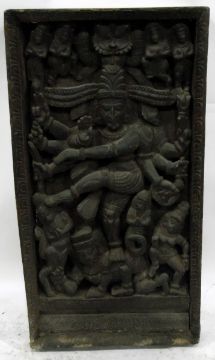 Old rectangular heavily carved panel from Arunachal Pradesh, depicting deity surrounded by figures, height 97cm