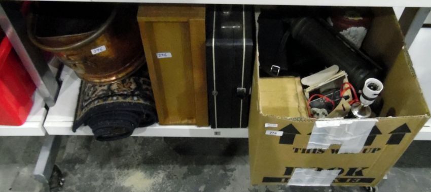 Mixed lot to include a table lamp, copper coal scuttle, carpet and other collectable items