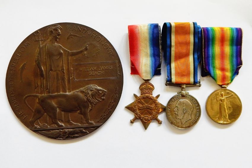 WWI Memorial plaque named to 'WILLIAM JAMES GEACH' and 1914-15 Star, War medal and Victory medal named to '132187 SPR W J GEACH RE'