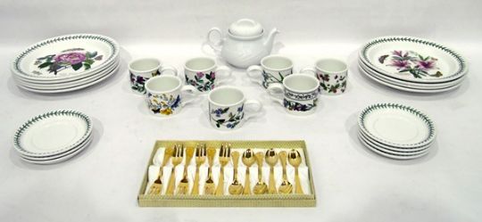 Quantity of Portmeirion 'The Botanic Garden' and other Portmeirion plates and mugs, a set of gilt coloured metal cake forks and teaspoons and a teapot