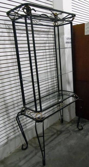 20th century metal and glass freestanding shelving unit, comprising three glass shelves, on cabriole supports, 90cm wide