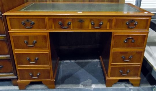 Modern yew finish reproduction kneehole pedestal desk, having an arrangement of nine drawers and with tooled leather inset top